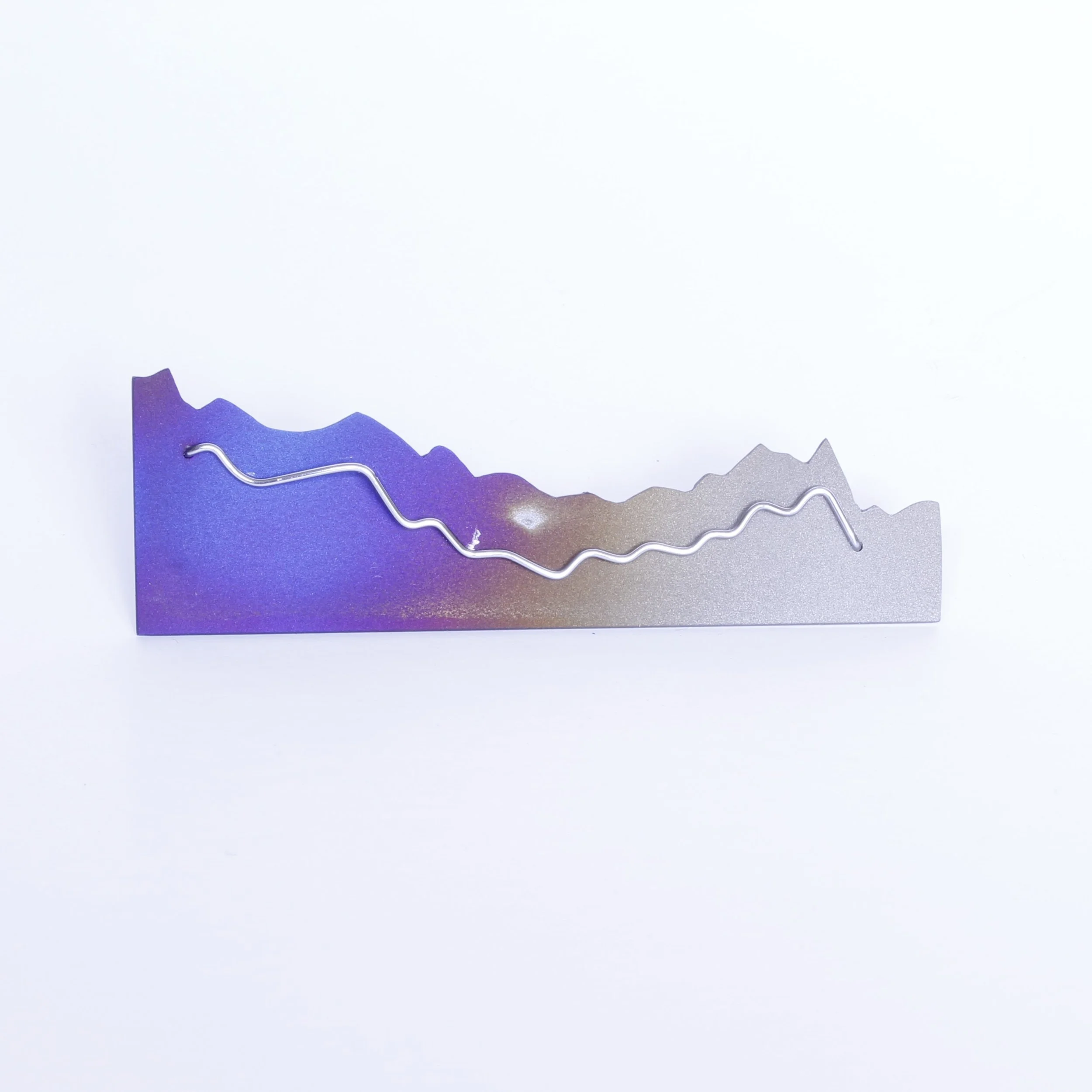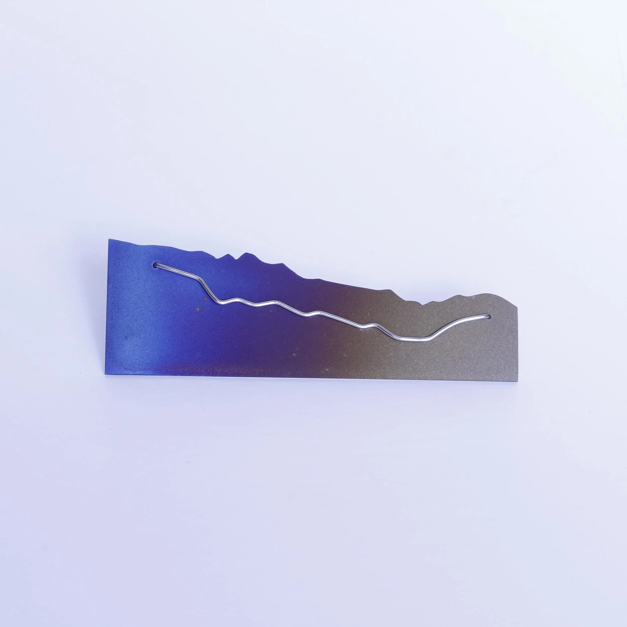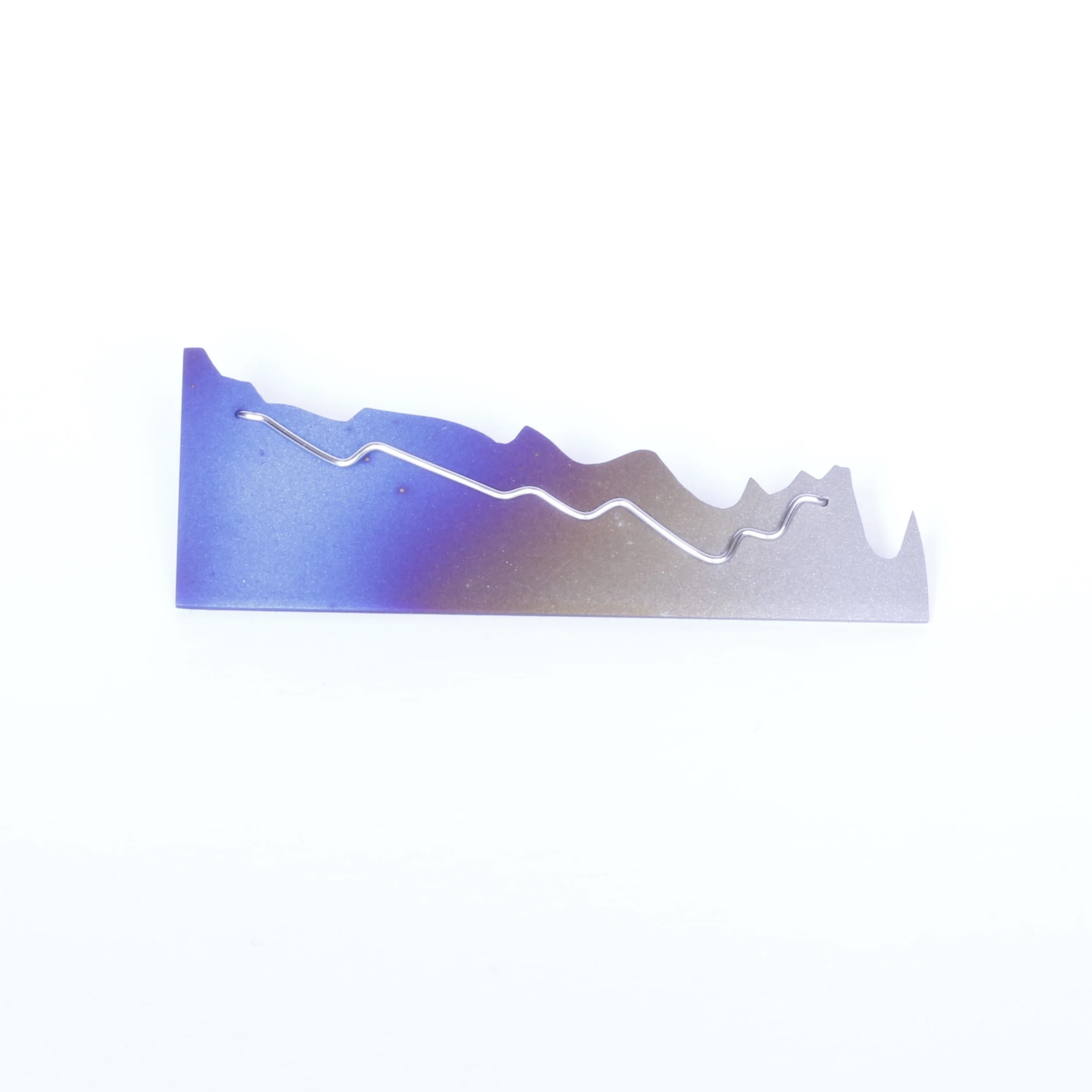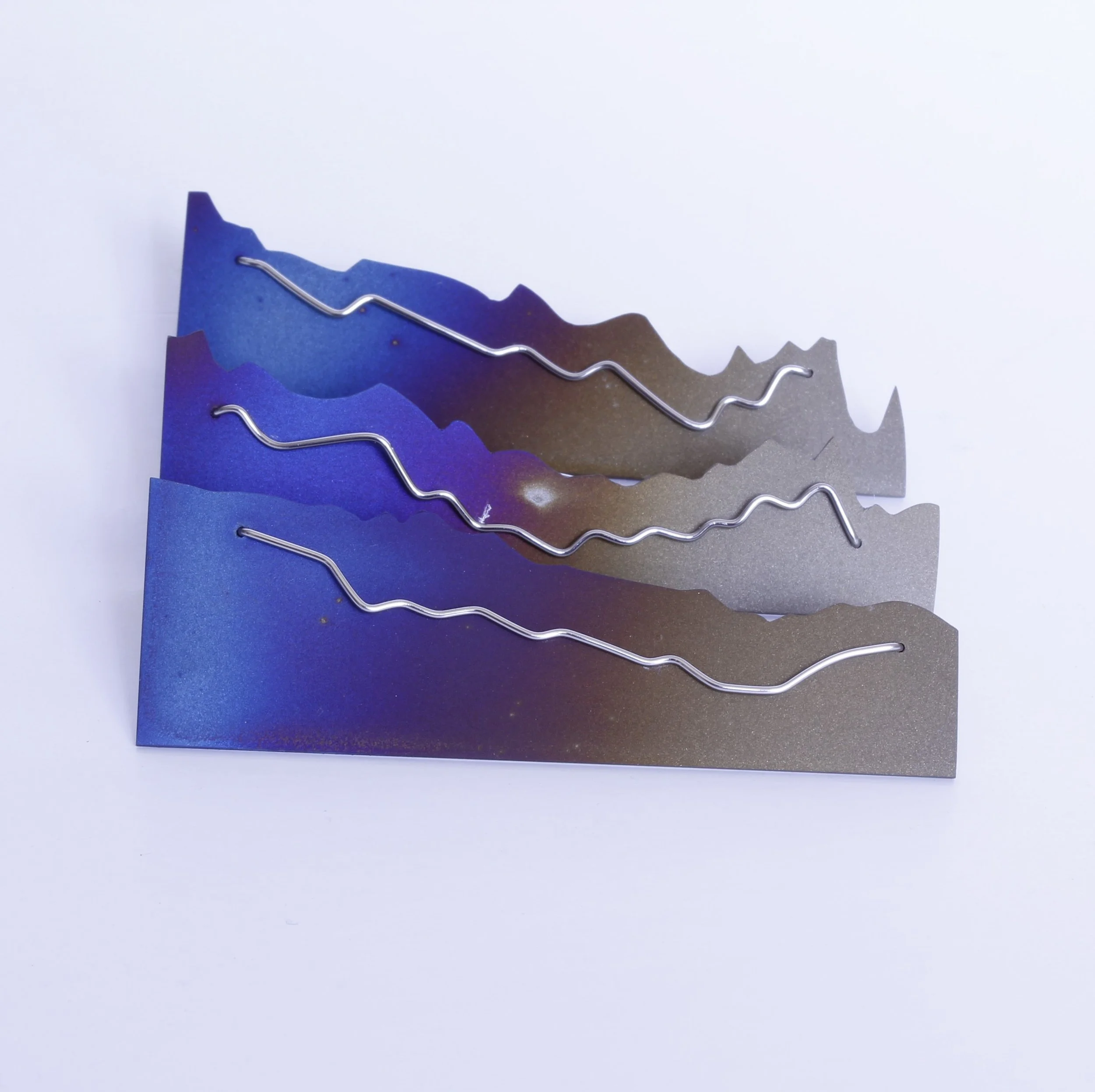 Each brooch is a graph of the population decline of a species of marine animal – Tuna, Sharks and Rays, and Mackerels. They are made from titanium and have been heat treated to reveal colours that further emphasise the change in populations. The brooch pin echoes the graph as well as being the functional pinning mechanism.